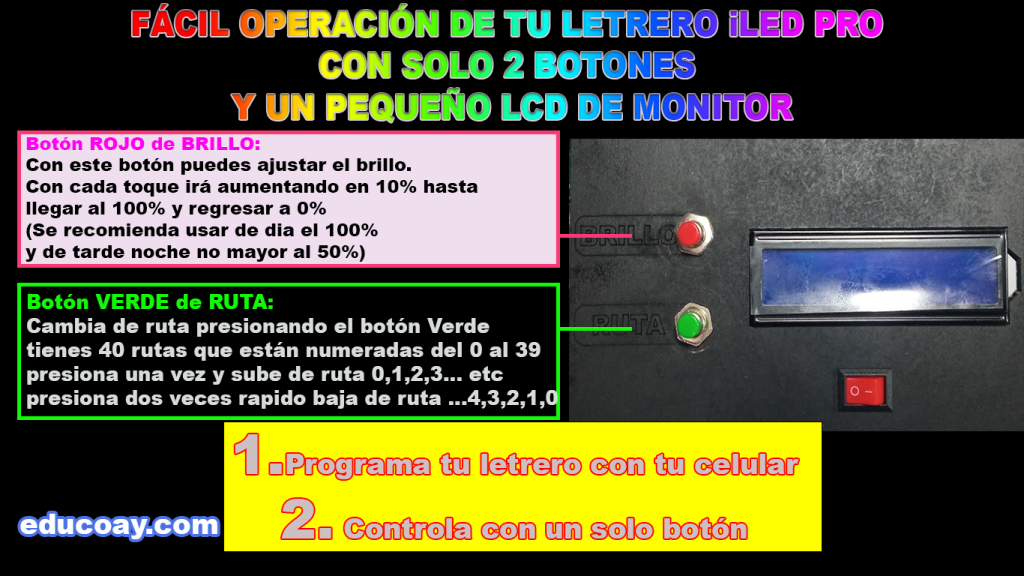 Alta Visibilidad y Claridad Nuestro letrero LED RGB está diseñado para ofrecer la máxima visibilidad, incluso en condiciones de luz adversas. Gracias a su tecnología LED de alta luminosidad, los mensajes y anuncios son claramente visibles tanto de día como de noche, asegurando que sus pasajeros siempre estén informados.